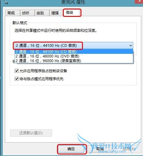 将内置麦克风的音量调整到50左右,麦克风加强调整为“0”。修改麦克风格式默认CD音质,具体在Win7和Win8系统下的设置如下: