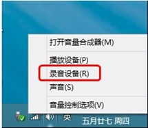 在桌面右下角的任务栏找到喇叭的图标,右键点击喇叭,出现以下提示,左键点击选择“录音设备”;