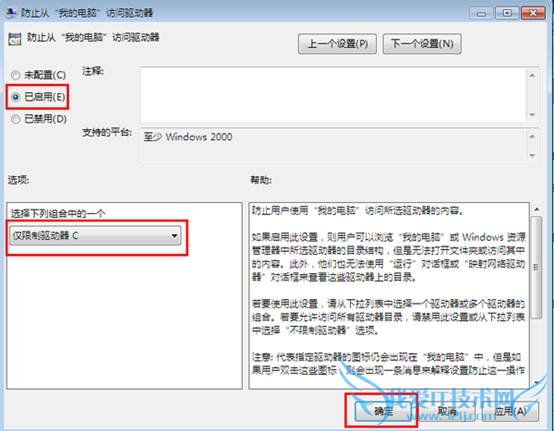 3.在打开的界面中,右上角选择“已启用”选项,右下角下拉菜单,选择“仅限制驱动器C”,点击“确定”按钮保存退出。
