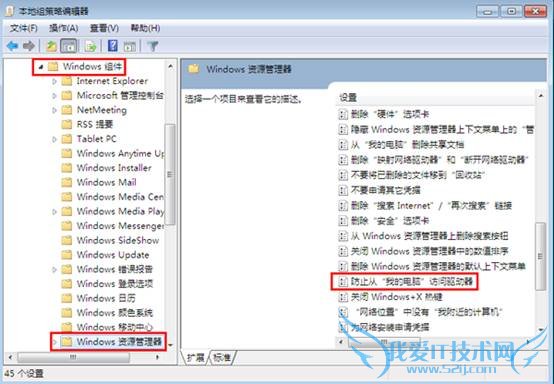 2.打开本地组策略编辑器后,从左边栏目依次进入“用户配置” — “管理模块” — “windows组件” — “windows资源管理器”,双击右边栏目中的“防止从‘我的电脑’访问驱动器”