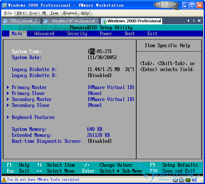 在启动的过程中鼠标在虚拟机中点击就激活了虚拟机的窗口是当前窗口,也一样可以按F2键进入虚拟机的CMOS设置,如图是进入虚拟机CMOS的截图: