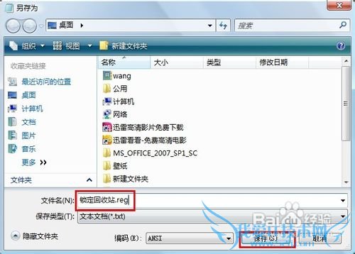 3、选择保存路径,输入文件名“锁定回收站.reg”,点保存。