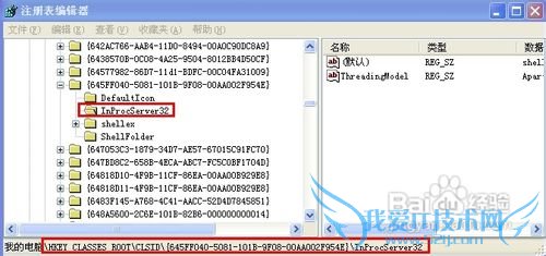 4、依次展开HKEY_CLASSES_ROOTCLSID{645FF040-5081-101B-9F08-00AA002F954E}InProcServer32。