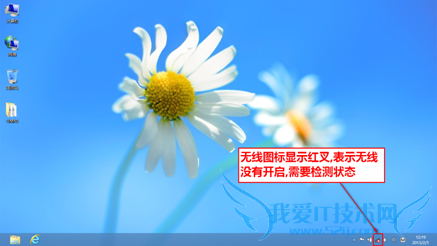 2. 进入到桌面模式,观察屏幕右下角无线图标,显示红叉,则需要进入超级菜单观察win8系统无线和飞行模式是否开启;