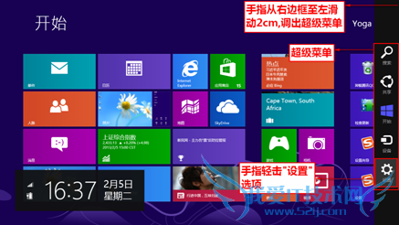 1. 开始进入win8 METRO界面,将手指移至屏幕右边框,随后将手指由右至左,轻轻拖动2cm,弹出超级菜单,手指点击“设置”按钮;