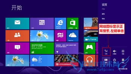 1. 开机进入windows 8 metro界面,确认无线开关开启后,,显示正常可以搜索网络的无线图标;