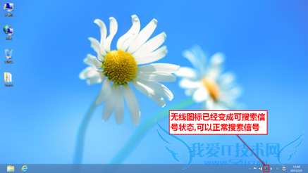 7. 设置完毕,退出设置界面,观察桌面右下角无线图标状态,如果已经从红叉的关闭状态,转变成可搜索信号状态,可以进行无线设置;