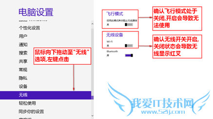 6. 进入“电脑设置”选项后,将鼠标向下点选“无线”,确认无线开关和飞行模式开关的状态,进行正确设置;