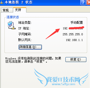 第二种方法,如果你用到的是XP系统,也非常简单。双击右下的"本地连接”,弹出的信息中也可以找到IP地址。