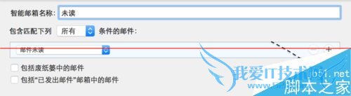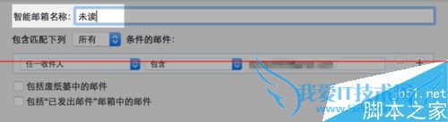 4、随后会弹出小窗口,用以设置智能邮箱。比如在这里我打算创建一个名为“未读”的智能邮箱,到时候可以直接点击这个“未读”邮箱查看所有的未读邮件。