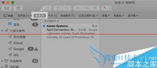 7、随后在邮箱列表的“智能邮箱”下方,可以看到我们刚刚创建的“未读”邮箱了。点击它以后就可以看到当前邮件中所有的未读邮件,是不是很方便。