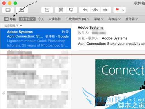 1、在 Mac 上打开邮件应用以后,请先点击窗口左上角的“邮箱”选项,如图所示