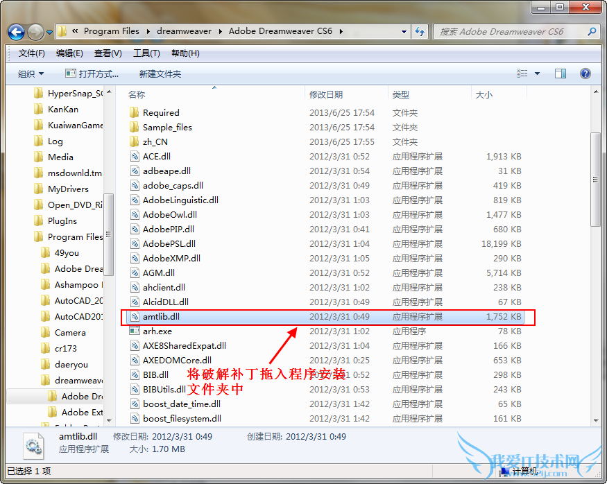 打开Dreamweaver cs6安装文件夹,将适合自己系统的破解补丁文件夹中的文件拖入程序安装文件夹中覆盖同名文件