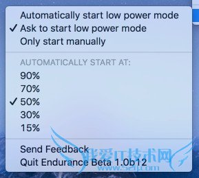 Endurance 有三种启动模式:自动开启、询问开启和手动开启,默认情况下它会在电量低于特定值的时候开启,如果您对续航时间要求极高,可以选择在低于 90% 的情况下自动开启。