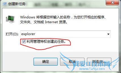 最后,选择“文件”,“新建任务(运行...)(N)”,在弹出窗口中键入explorer,此时在输入框下将看到“利用管理特权创建此任务”选项,我们就是要勾选它,之后回车或是点击“确定”即可。如图二: