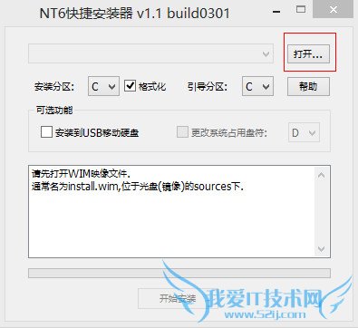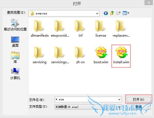 5.通过“打开”按钮在刚才加载的虚拟磁盘中的sources文件夹中找到install.wim文件进行安装,如图:
