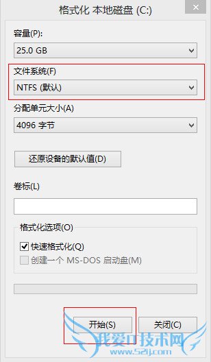 8.在弹出的格式化窗口中,将文件系统格式改成NTFS格式,然后单击“开始”按钮,如图: