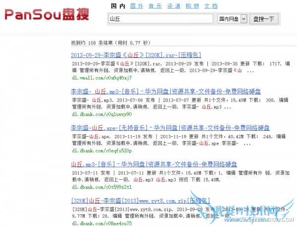 现在很多用户通过网盘分享文件,音乐当然是其中重要的一部分。因此通过对知名网盘进行搜索,也许可以找到自己喜欢的音乐文件。首先通过浏览器打开一个网盘搜索页面(pansou.com),在搜索框中输入音乐名称以及要求的格式,比如“山丘 320k”或者“山丘 ape”等。然后点击“盘搜一下”按钮,这样就可以在国内的各大网盘中进行搜索了。当搜索结果出来后根据介绍进行选择,从而下载到高质量的无损音乐(图1)。