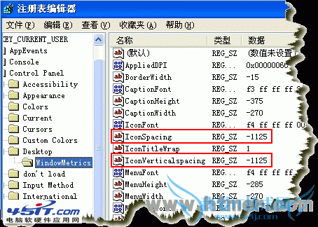 2、在注册表编辑器左边的窗口中点击WindowMetrics项,然后在右边的窗口中分别找到键值IconSpacing(用来确定桌面图标水平间距)和键值IconVerticalSpacing(用来确定桌面图标垂直间距),它们的默认值为-1125,你可以将它们的值设为默认值,或者根据实际情况自己设定大小,相关截图如下所示: