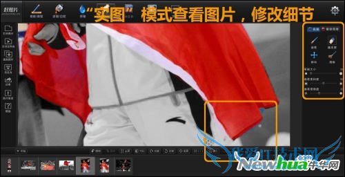 第三步,切换到实图模式放大图片,检查细节部分,利用“橡皮擦”功能对上色的国旗进行细节的处理完善。
