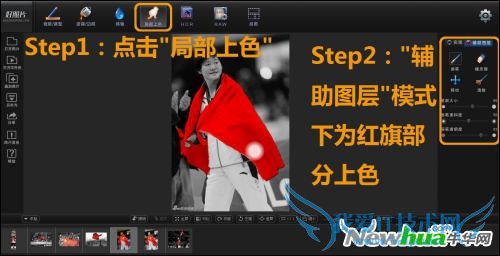 第二步,上方的菜单栏切换到“局部上色”,调整笔刷的大小、柔和度与透明度,将红旗的部分进行上色涂抹。