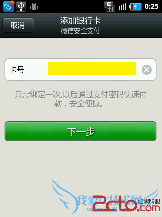 点击“支付”按钮后,就会自动转到“添加银行卡”界面,在此输入银行“卡号”,并点击“下一步”。