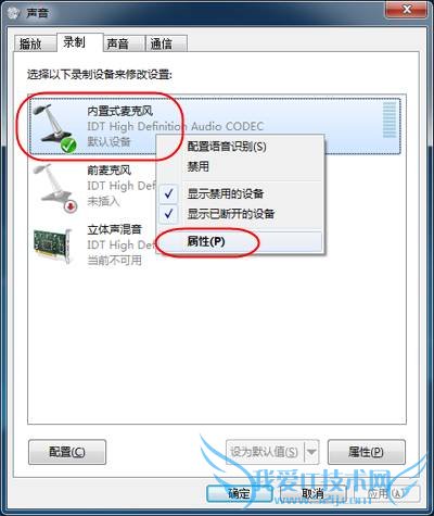 2、在弹出的“声音”对话框中,点选“录制”选项卡,鼠标指向麦克风(根据机器配置不同会有Realtek、Conexant、IDT等字样)单击右键,在弹出的菜单中点选“属性”;