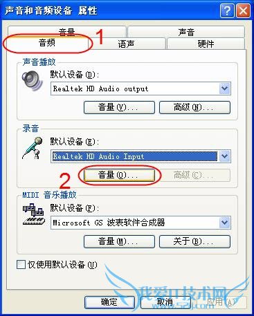 2、在弹出的“声音和音频设备属性”对话框中,点选“音频”选项卡,选中录音默认设备(根据机器配置不同会有Realtek、Conexant、IDT等字样),点击“音量”;