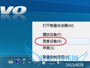 单击右键,在弹出的菜单中点选“录音设备”;