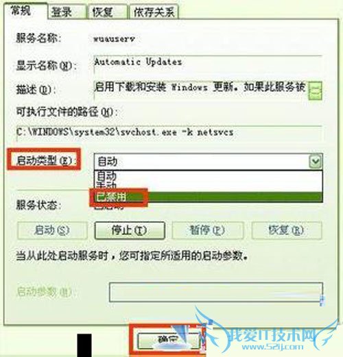 双击AutomaticUpdates项会出现AutomaticUpdates的属性设置窗口,在窗口的启动类型里通过点击右边的下拉箭头选择已禁用,然后再点击确定关闭窗口即可