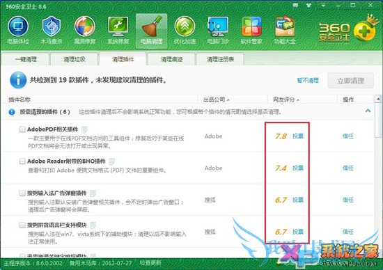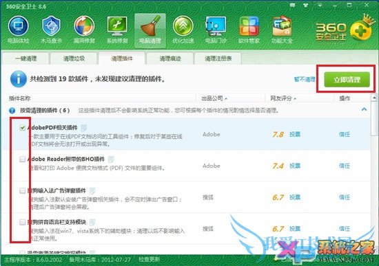 4、扫描完毕后,勾选恶意插件,点击立即清理即可。不太懂电脑的朋友可以看插件说明或评分,根据情况来清理;