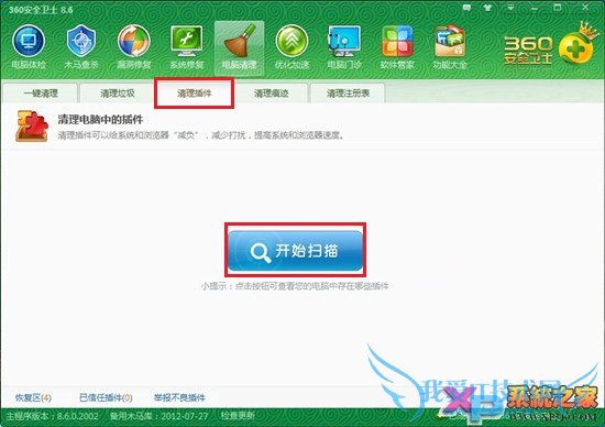 3、切到清理插件一栏,点击开始扫描,360会自动扫描电脑中安装的所有插件;