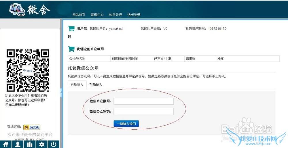 第三步:添加微信公众账号并绑定微信公众平台(托管微信公众号,可以一键生成微信信息并绑定微信号。如果您熟悉微信信息并且能自行绑定,可选择手工接入。)