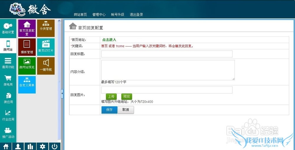 第五步:选择微舍3G网站搭建。首先配置首页回复配置,填写后用户会收到的微网站图文介绍。