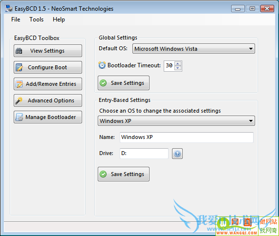 此刻,赶来救场的是来自Neosmart的EasyBCD。它为BCDEDIT提供了一个图形界面,这样,操作就很简单了。程序里有很多选项,这些选项取决于用户的需求。此刻,仅需要选择“启动设置”,更改Windows 安装程序的名字为“Windows XP”,点击“保存设置”。重启系统,之后用户就会看到修改后的信息已经存入启动项管理程序。