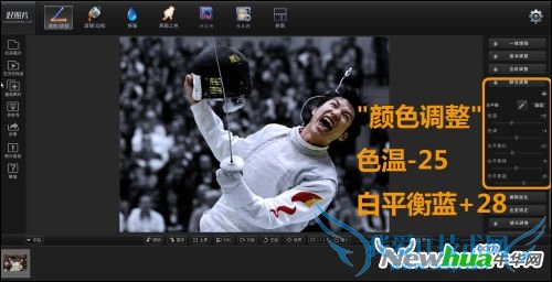 第三步,右方工具栏中点击“颜色调整”,降低色温并加大白平衡蓝的比重,这样做是为了让画面整体颜色有种和谐之感。偏蓝色的色调体现出了男性在赛场中的沉稳与击剑运动本身的贵族气质,而雷声在画面中独有的色彩则在这片沉寂中爆发出来,让图片的戏剧冲突性更强,从而更好地烘托了在胜利时刻,王者屹立山巅的精神世界。