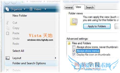 通过以上的步骤,这样,即可让资源管理器的菜单项一直显示。而如果随着对Windows Vista使用时间的延长,适应了Windows Vista的操作习惯后,也可按同样的步骤将资源管理器菜单项关闭,只需重复以上的步骤,取消对“一直显示菜单(Always show menus)”的选择。