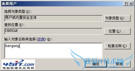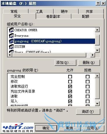 通过上述操作,我们赋予了gongyong组和bangong用户对相同资源的不同访问权限。当然文中所举实例比较简单,你可以根据实际情况为硬盘资源设置更为合理的访问权限。以上方法同样适用于Windows 2000和XP。