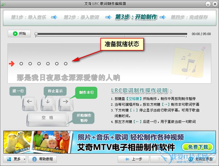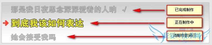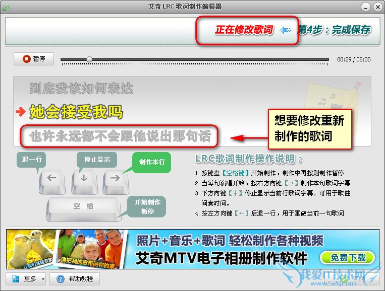 【技巧 2】如果某行歌词制作时,觉得时间点没有掌握好,想要重新退回制作的,只需敲击向左方向键“←”即可退回。用此方法可以退到之前任意一行歌词。当退后到想要重新制作的歌词行后,按照制作方法,按键盘右方向键“→”继续歌词的制作即可。