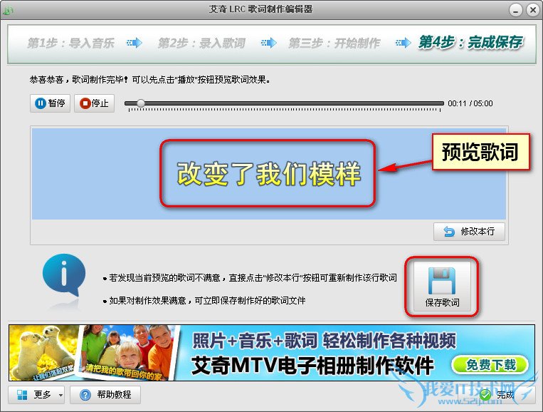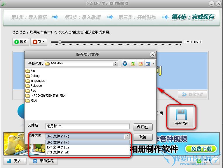 如果预览没问题,则点击“保存歌词”按钮保存已制作的歌词, 歌词可以保存为LRC、TXT 和 SRT 格式。