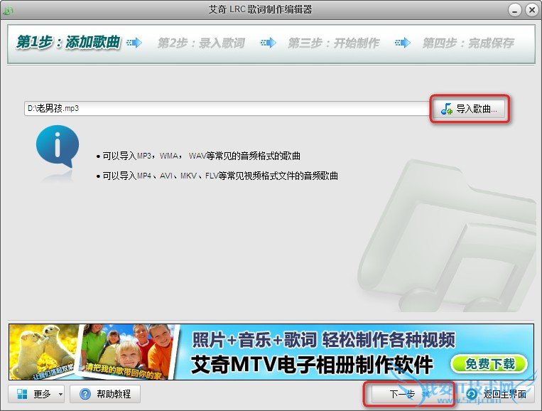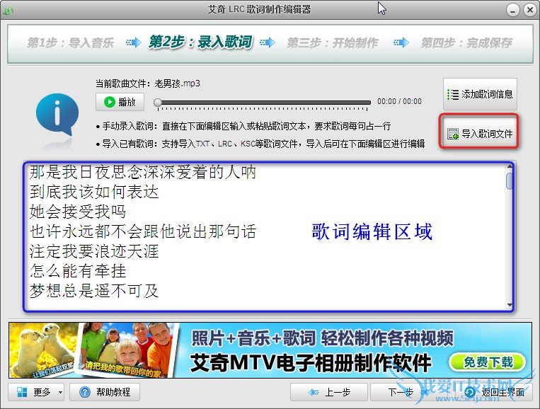 导入好歌曲文件后,点击“下一步”按钮进入录入歌词的步骤。