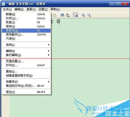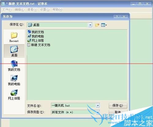4、点击“另存为”,在文件名窗口中将名称改为“一键关机.bat”,然后保存。桌面上就创建了一个叫“一键关机”的批处理文件。打开它,效果就等于正常关机程序,“开始”—>“关闭计算机”—>“关闭”,这三个步骤。