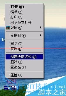 1、在批处理文件上按鼠标右键,将指针移动到“快捷方式”上,点击。桌面将会产生一个叫“一键关机”的快捷方式。