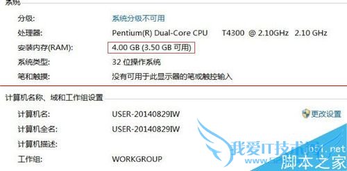 6、开机完毕后,我的电脑→属性就能看到内存由原来的2Gb变为4GB了,不过由于小编的系统是32位的所以最高只支持大概3.5Gb,大家可以装64位系统,让电脑变为真正的4GB内存。