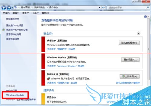 4、进入操作中心,我们可以看到左下角有一个Windows Update选项,我们点击进入。