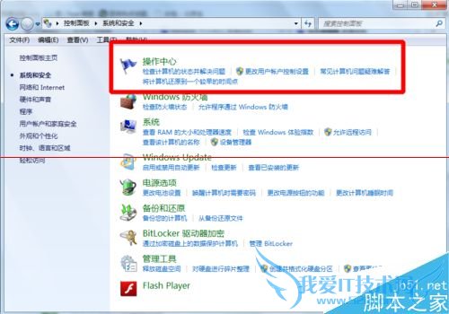 3、进入系统与安全界面之后,我们点击最上方的操作中心。进入操作中心。