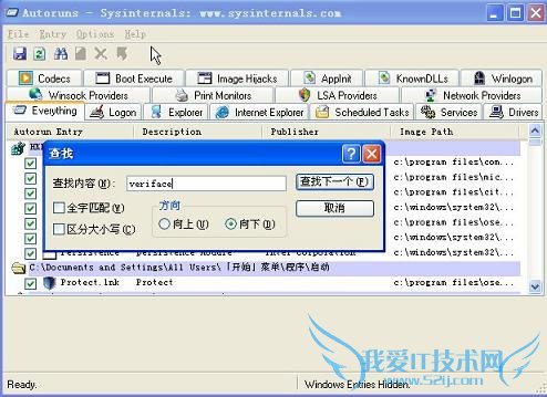 1、运行autoruns软件,在everything里面是用快捷键ctrl+f搜索veriface。(如图)