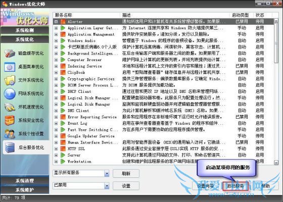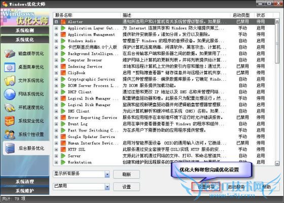 注:具体停用或禁用那些服务,使用者应该根据自己的实际情况并结合Windows优化大师对于该服务的描述信息来决定。