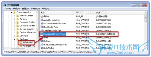 打开注册表编辑器,依次展开HKEY_CURRENT_USERSoftwareMicrosoftWindowsCurrentVersionExplorerAdvanced ,右侧新建DWORD类型项,名称ExtendedUIHoverTime,数据10进制设10000(10秒)或者更长。