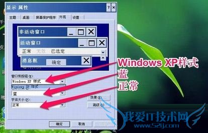 3、在“外观”标签页面下,依次将窗口和按钮设置为“Windows XP样式”,将颜色方案设置为“蓝”,将字体大小设置为“正常”;